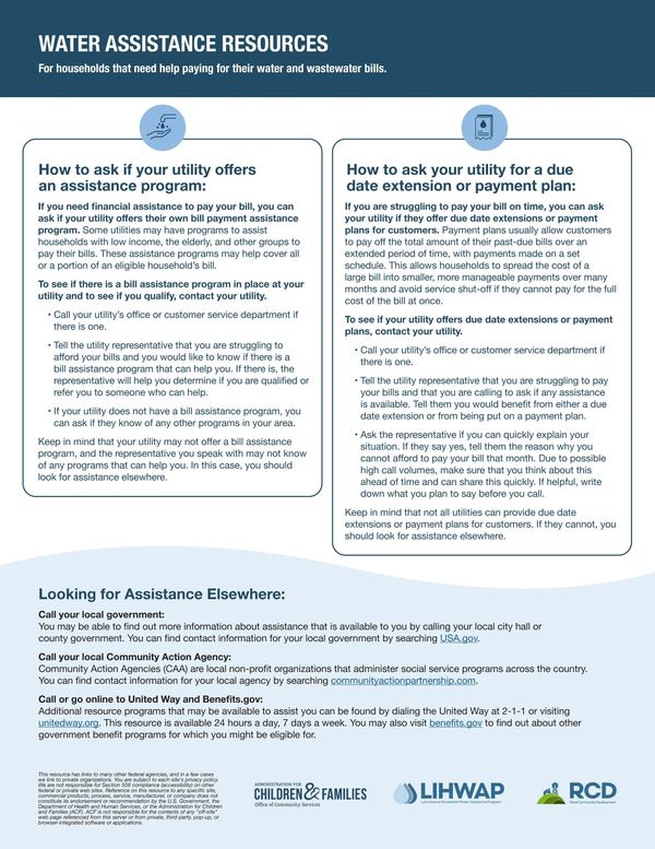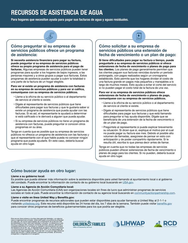 Recursos de asistencia de agua para hogares que necesitan ayuda para pagar sus facturas de agua y aguas residuales.