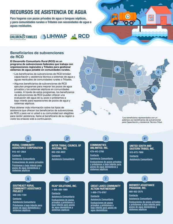 Recursos de asistencia de agua para hogares con pozos privados de agua o tanques sépticos, y para comunidades rurales o Tribales.